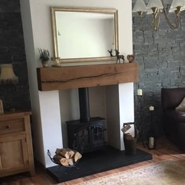 We get many requests from clients for Oak and Pine Beams, in this case our client chose to use an oak beam as a mantle above their wood burning stove. Bow ties were used to ensure the crack did not spread as the client felt it gave the beam more character. It was then finished with a rugger brown stain wax.